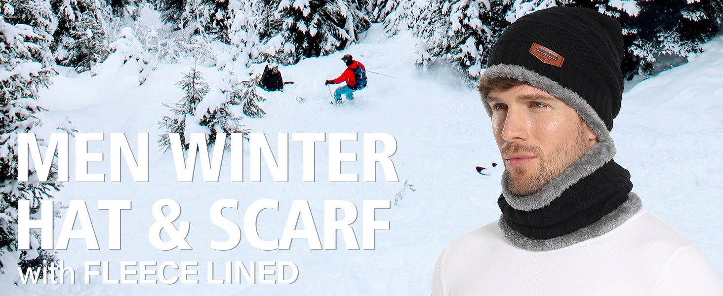 2-Pieces Winter Beanie Scarf Set Warm Knit Hat Thick Fleece Lined for Men Women